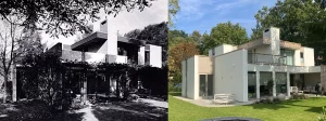 En dan komt er een nieuwe eigenaar die hier misschien lak aan heeft en klakkeloos de aanwijzingen van de makelaarstekening volgt. Het zal toch niet gebeuren? We zullen het niet weten, omdat de binnenkant voor de buitenstaander gesloten blijft. Maar mijn angst werd gevoed toen de busjes van de stucadoor voor de deur stonden. Ik durfde lange tijd niet meer te kijken. Maar de schrijversplicht van de columnist roept en ik ben er langs gegaan. Tot mijn grote opluchting heeft de nieuwe eigenaar slechts het metselwerk met stucwerk vlakgepoetst en het houtwerk van een nieuwe kleur voorzien. En nu blijkt dat de vormgeving van het oorspronkelijke ontwerp dermate sterk was dat de veranderende gevelafwerking geen afbreuk doet. Klasse van Jan Kleinjan. En hulde aan de nieuwe eigenaar.