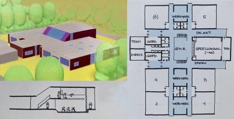Maar goed, de school kwam er, mét het zesde lokaal. En slechts een paar jaar later kwamen er nog twee lokalen bij. En onlangs is de school verdubbeld (door een andere architect). Nog even terug kijken naar het ontwerp van toen. Jenaplanonderwijs betekent groepslessen in het lokaal en de individuele lessen, op het kind afgestemd, erbuiten. In zogenaamde werkhoeken. Die extra ruimte werd gefinancierd door de lokalen kleiner te maken. Mijn ontwerp ging uit van een dubbele corridor met de werkhoeken en de toiletten tussen de gangen. In het centrum van de school kwam een hoge Gemeenschappelijke Ruimte met een glasdak. Door het Speellokaal ernaast te leggen, kon door het openen van een schuifwand, één grote ruimte worden gecreëerd. Die grote ruimte is belangrijk voor het Jenaplanonderwijs. Bijvoorbeeld voor de weekafsluiting waarbij alle kinderen van de hele school aanwezig zijn. Bovendien werd het Speellokaal verdiept aangelegd waardoor de toeschouwers in de Gemeenschapelijke Ruimte over de kinderen in het Speellokaal heen konden kijken naar het podium.