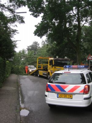 Haren, 23 augustus- Een hoge boom op de hoek Nesciolaan-Meerweg is gisteren omgevallen. Door een ongelukkig toeval passeerde net een automobilist, die het vallend geboomte niet kon ontwijken.Een 67-jarige automobilist uit Assen is woensdagmorgen gewond geraakt nadat in de Nesciolaan in Haren een boom op zijn auto was gevallen. De boom was ongeveer 25 meter groot. Om de boom weg te kunnen krijgen, was het nodig de straat korte tijd af te sluiten. De boom bleek bij controle rotte wortels te hebben. De Assenaar is voor controle naar het ziekenhuis gebracht. De politie maakt een registratie van het ongeval. Foto is van Bob de Vries uit Haren.
