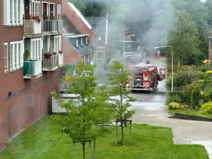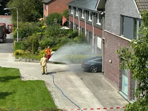 Attente brandweer. Troep die door de brand op een auto was gekomen wordt eraf gespoten.