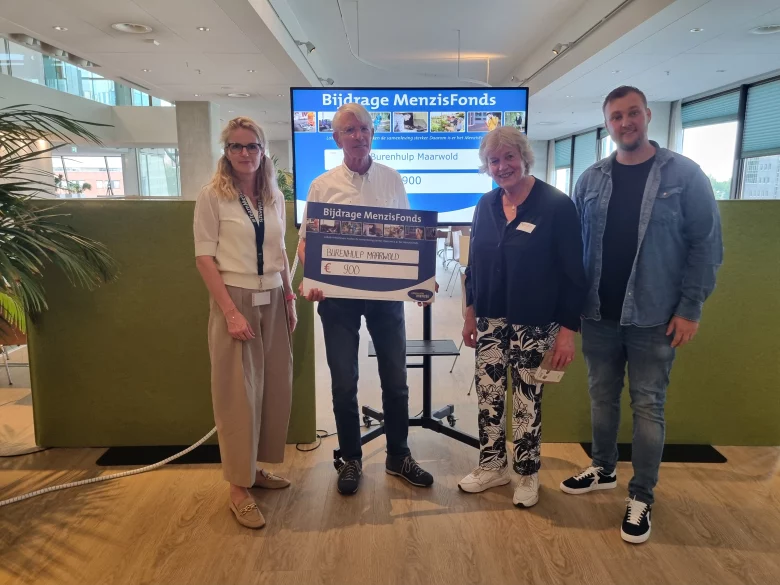 Op 25 juni namen Paul Oostinga en Marijke van de Hoef de cheque ter waarde van € 900 in ontvangst uit handen van mevrouw Carolien Bos, directeur klant en markt van de zorgverzekeraar Menzis.