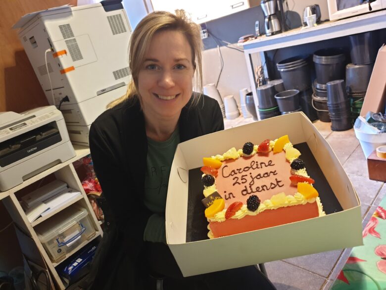 Op 28 februari, precies 25 jaar na haar eerste werkdag in 1998 (eerst in Bolhuis’ winkel in de stad) werd er bij bakkerij Haafs een fraaie taart besteld en werden kleurige ballonnen opgehangen door haar collega’s Wenke en Anneke. De jubilaris straalde.