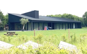 Er is niets dat het beeld verstoort. De twee identieke volumes zijn met de hoge zijde evenwijdig aan elkaar geplaatst. Door ze te verschuiven ontstaat een korte binnenstraat waar de gevels gesloten zijn en waar de entrees verrassend ingepast zijn. Een dakopbouw wijkt af van de standaard, maar geeft nou net die afwisseling die het beeld spannend maakt. Deze opdrachtgever heeft als geen ander beseft dat zijn forse nieuwe bouwvolume niet een toevoeging aan het lommerrijke landschap moet zijn, maar juist een bescheiden inpassing. En daarvoor heeft hij een architect uit Brabant gekozen, die heel goed heeft begrepen hoe je in Drenthe moet bouwen.