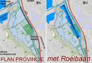 De feiten. Er is door de provincie een inrichtingsplan gemaakt voor Nieuwe Natuur in de polders langs de A28/het Noord-Willemskanaal, ten zuiden van de Meerweg. Zie het linker plaatje. Deze polders krijgen een functie als noodwaterberging. Dat betekent veel ondiep water (het lichtblauw), rietvelden, bossages, etc. Een lust voor planten, broedvogels, vissen en vele andere diersoorten. Het ziet er prachtig uit, zoiets als de Onnerpolder. Als je nou het water evenwijdig aan de A28, tot aan de Witte Molen, iets dieper maakt, zeggen de roeiverenigingen, dan kan er een nieuwe roeibaan komen (zie het rechter plaatje). Een ideale plek om te roeien en een perfecte combinatie met de natuurontwikkeling in de polder. Ik ben geen roeier, maar ik weet wel dat er geen rustiger sport is dan de roeisport. En een stuk stiller dan de snelweg. Er zijn veel voorbeelden van roeibanen die ingepast liggen in de natuur: het kan heel goed!