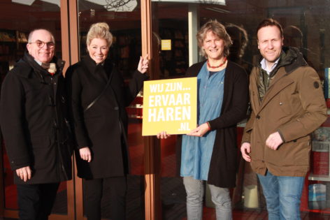 Dinsdag 21 januari hebben Daphne de Haan, Linda Goes, Germen Olivier en voorzitter Henk Broekema van Ondernemend Haren de eerste deursticker geplakt op de winkelruit van boekhandel Boomker aan het Raadhuisplein in Haren.