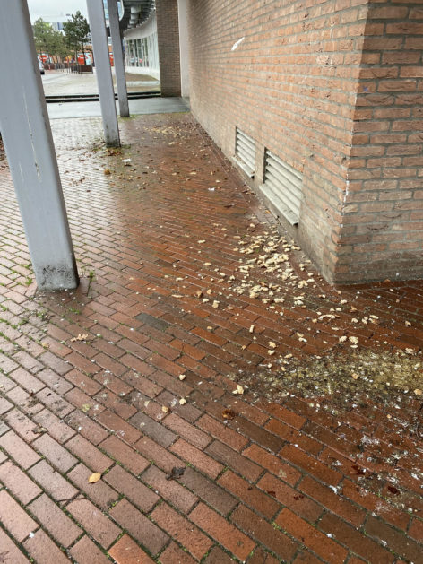 Op de hoek van de Molenweg en het Haderaplein is het een vieze boel. Vogels, met name duiven, veroorzaken daar nogal wat vervuiling door vogelpoep.