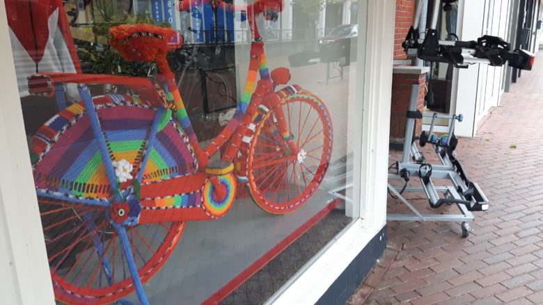 Deze fiets is blikvanger in de etalage van de Fiets Shop aan de Meerweg in Haren. Eigenaresse Erna Lambeck woont in Westerbroek en ontmoette daar een dame die een jaar lang had gehaakt om een fiets aan te kleden.
