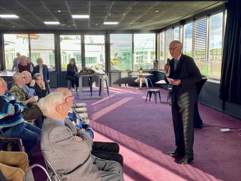 Daarna nam luchthavendirecteur Meiltje de Groot het woord. Zij schetste een dynamisch beeld van de actuele ontwikkelingen. De geopolitieke situatie in Oekraïne, Gaza en de hernieuwde aandacht voor defensie zorgen ervoor dat ook Eelde op de radar staat, bijvoorbeeld voor militaire transportvluchten. Daarnaast lopen er gesprekken over samenwerking met energiebedrijven rond waterstofontwikkeling op de luchthaven.”