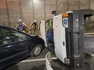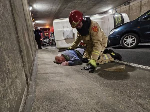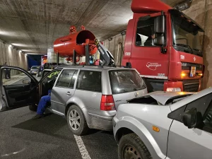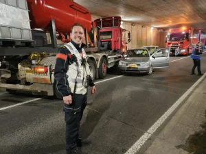 Het is 19.35 uur. Rond deze tijd gebeurt er een ernstig ongeval in de tunnel. Fictie. Surrealistisch, want de voertuigen liggen of staan als in een macabere mis-en-scène in het schijnsel van de straatverlichting. We zien twee vrachtwagens in een onnatuurlijke positie, waarvan één tegen de betonnen wand gebotst. Er ligt een camper op zijn kant en er staan drie auto’s die met elkaar in botsing zijn gekomen. Hulpgeroep. “Doe wel even een hesje aan”, zegt Berkhof. “Anders word je aangezien voor slachtoffer.” In de auto’s zitten of hangen slachtoffers. Op het wegdek ligt een man roerloos. In één van de vrachtwagens zitten twee mensen, waarvan één, de bestuurder een hartaanval heeft gehad, waardoor zijn wagen op de verkeerde weghelft was gekomen. Dit was de oorzaak van de fatale kettingbotsing. Tot overmaat van ramp begint er een onbekende vloeistof uit het voertuig te lekken, naar later blijkt zwavelzuur. In serene rust wacht deze onheilsplek nu op de hulpverleners, die voor deze oefening wachten op het Transferium in Haren. Tegen 20.00 uur worden zij gealarmeerd. Berkhof heeft voor deze mega-oefening vooral vrijwilligers kunnen charteren. Verkeersregelaars, slachtoffers, hulpverleners, een rijschool die twee vrachtwagens beschikbaar stelde, grondverzetbedrijf dat wrakken op hun plek legde. En natuurlijk tientallen brandweermensen uit de wijde omtrek, politiemensen en ambulancepersoneel. Gedreven en gemotiveerd, onbetaald en daarmee onbetaalbaar. De hulpverleners moeten nu eenmaal kunnen oefenen en fouten maken. Leermomenten.