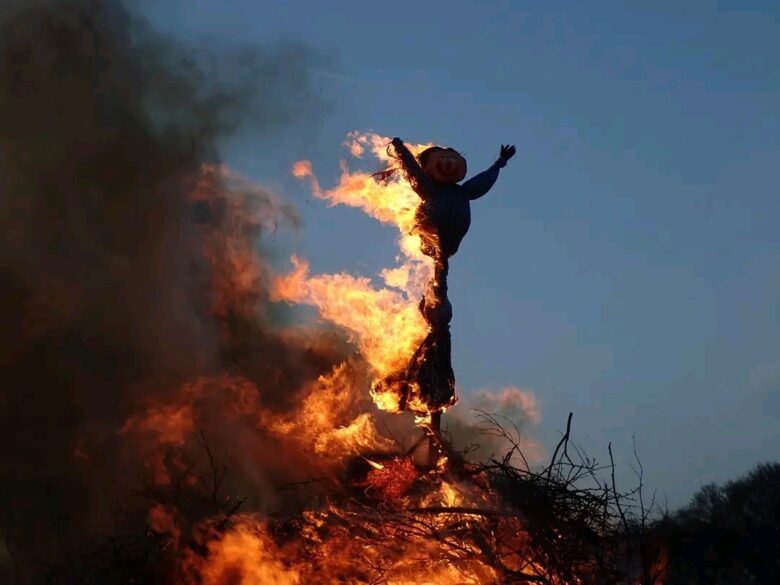 Het paasvuur in Noorlaren op eerste paasdag was weer een mooie vertoning. Met prima weer ging de brand in een bult hout, waarop een pop was geplaatst die zoiets verbeeldde als het kwaad. Kwade geesten? Judas die Jezus verraadde? Of was het de nagedachtenis aan Jeanne d’Arc, zoals een lezer suggereerde?