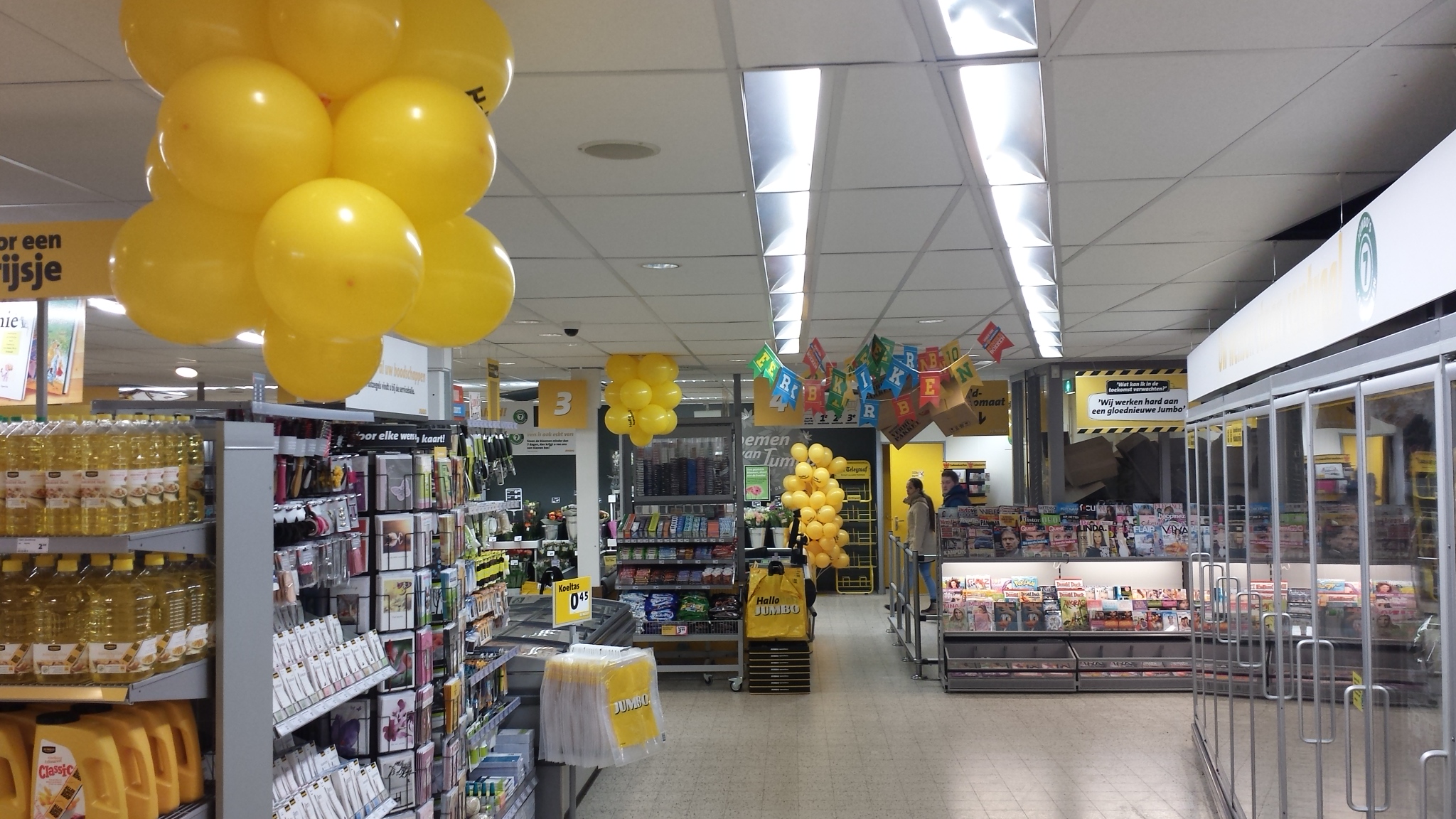Volgens een symbolisch ritueel stond het personeel, voltallig overgenomen van C1000, buiten klaar voor de groepsfoto met bedrijfsleider Ger Pesman. Als VIPs telden ze af (van zeven naar één vanwege de zeven zekerheden van de formule Jumbo) en toen knalde het en vlogen slingers door de lucht. In de wijk gonst het, want men is blij met Jumbo. “Zo’n sterke formule is cruciaal voor de wijk”, zei groenteman Erik Berends. “Het was een voorwaarde voor onze winkels om verder te gaan met de nieuwbouw. De Jumbo is een trekpleister die het publiek uit de wijk en daarbuiten naar de Anjerlaan gaat lokken. Ik hoop dat we het imago krijgen van een winkelcentrum waar je de dagelijkse boodschappen kunt halen.” Bedrijfsleider Ger Pesman liep trots rond en straalde. “We hebben nu nog volstaan met het aanpassen van de winkel, maar volgend jaar openen we hier een compleet nieuwe supermarkt die twee keer zo groot is.”