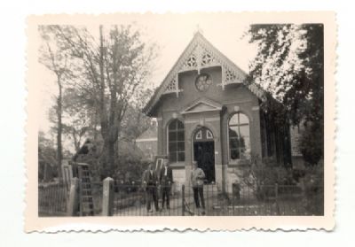 Nostalgia in de moderne media. We ontvingen een nostalgische foto van Klaassien Timmer uit Noordlaren. De foto toont het Leerhuis in Noordlaren, dat in 1958 werd gesloopt. Het stond ooit recht tegenover de pastorie van dat schilderachtige dorp.Het Leerhuis werd gebouwd in 1886 en heeft aan de Lageweg gestaan, recht tegenover de pastorie. Het Leerhuis werd gebruikt als catechisatielokaal en tevens werd er zondagschool gehouden. Bijna elk kind uit het dorp ging hier naartoe. In 1900 werd er vanuit de Ned. Herv. Kerk een jongelingsvereniging genaamd Andreas opgericht, door de heren J. Ebbinge, E. Veening, H. Sant en R. Timmer. Daar kwam in 1923 nog een meisjesvereniging bij met de naam Ruth. Voor beide verenigingen moest men 16 jaar oud zijn. In 1933 werd er voor de 12 tot 16 jarige meisjes (Lentetij) en jongens (Benjamin) eveneens een vereniging opgericht. Al deze verenigingen maakten gebruik van het Leerhuis. Tijdens de oorlog kon het Leerhuis niet gebruikt worden omdat het door de Duitsers bezet was. Daar men een wat grotere zaal met een toneel toch wel miste, werd er in 1958 een stuk aan de kosterij gebouwd en zo ontstond de huidige Hoeksteen. Het Leerhuis is dan overbodig geworden en wordt jammer genoeg afgebroken. De foto is gemaakt door de tante van Klaassien Timmer uit Noordlaren