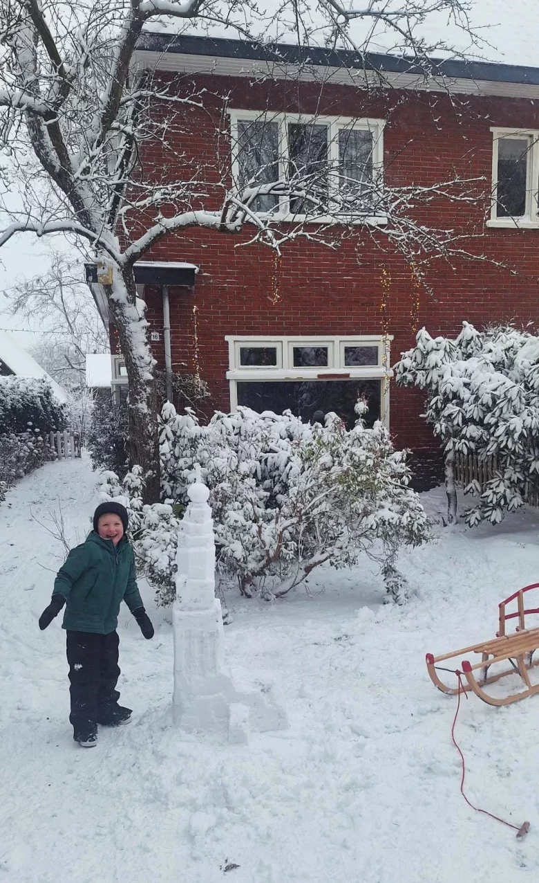 Nog zo jong, maar nu al zo creatief. Mees Doorn uit Haren maakte geen sneeuwpop, maar een replica van de Martinitoren.