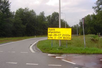 We meldden al dat de toerit naar de A28 vanuit Haren naar Groningen langer dichtblijft wegens de werkzaamheden.Gisteren, 9 augustus om 18.00 uur zou de weg weer open gaan, wij wilden er graag getuige van zijn. Maar helaas kwamen er geen mensen om de borden weg te halen, maar om de datum opnieuw op te plakken. Nu is de openstelling verplaatst naar 11 augustus 18.00 uur (zie foto). We wachten af met bewondering voor de harde werkers van de weg!