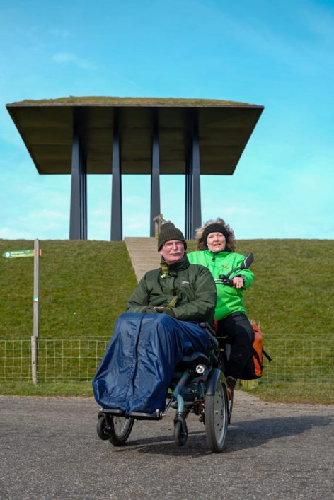 Maria en de zorgafhankelijke Freerk maken de reis samen. Hoewel Freerk henzelf gekscherend ‘krikkie en krakkie’ op de rolstoelfiets noemt, is dit natuurlijk in werkelijkheid een gouden koppel. “Onderweg is er soms best strijd”, erkent Maria Romp. “Dan wil hij links en ik rechts. En tja, ik stuur, dus dan wordt het vaak toch rechts, haha.” Tijdens hun tochten wordt er weleens gekibbeld, maar meestal is het heel gezellig. Eendrachtig zijn zij onlangs bij Taarlo nog een sloot ingereden en moesten er door omstanders uitgetrokken worden. “Wat een avontuur”, lachen de optimisten.