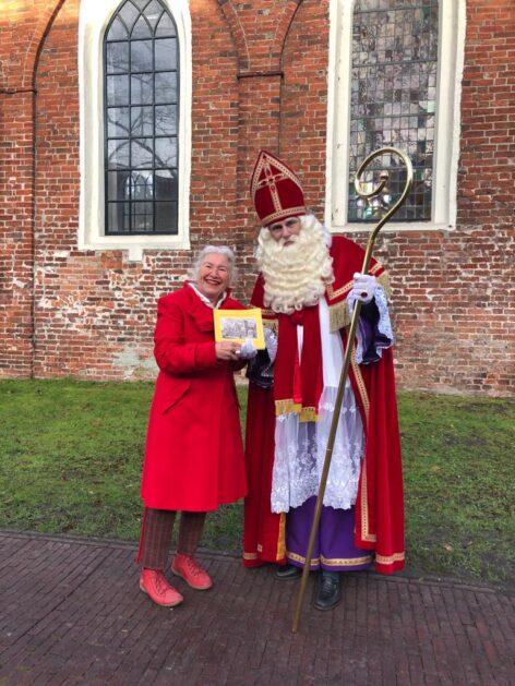 Zij bood de Sint het boek aan, dat de vroegere predikant, Rudolf Oosterdijk, heeft geschreven over de geschiedenis van de Dorpskerk in relatie tot de dorpsgemeenschap. Het boek is ook te koop bij boekhandel Boomker in Haren.