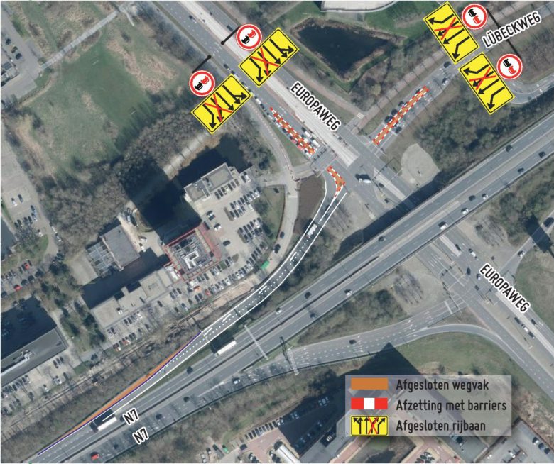 Een andere wijziging is dat verkeer op de Lübeckweg richting ringweg al voor het kruispunt moet ritsen naar één rijbaan. Verder komt er op het kruispunt een andere indeling van de rijstroken. De rijbanen worden gescheiden met zogenaamde barriers. Op woensdagavond 30 augustus start de aannemer om 22.00 uur met het plaatsen van de fysieke maatregelen op het Europaplein. Op donderdagochtend 31 augustus zijn de verkeersmaatregelen van kracht.