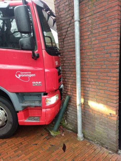 Dinsdagmiddag stapte een chauffeur van een vrachtwagen van de gemeente uit in De Brinkhorst. Hij wilde bij het nemen van de bocht juist schade vermijden en controleerde of hij erdoor kon. Maar hij vergat naar alle waarschijnlijkheid de vrachtwagen op de parkeerrem te zetten.