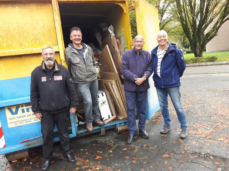 De container staat iedere vrijdag en zaterdag op het plein naast de kerk (Irenelaan). Op zaterdag van 9.00-12.00 uur zijn er bovendien vrijwilligers, die helpen met sjouwen. Op de foto staan Amel Blink, Henk Wester, Markus Wagener en Jan Derk Sluurman klaar om kranten in ontvangst te nemen. Er zijn ook vrijwilligers nodig voor de container die iedere 2e zaterdag van de maand aan de Meidoornlaan in Glimmen staat. Mail Jan Derk op hajade@home.nl
