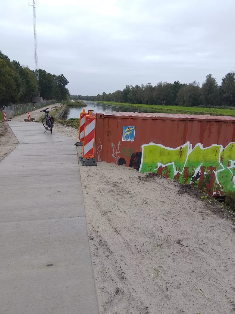 Een lezer stapte vandaag even van de fiets om de situatie op de fietssnelweg Haren-Assen beter te kunnen bekijken. Het fietspad (op talud) langs het Noordwillemskanaal is berijdbaar, maar nu lijkt het alsof de bouwers hebben moeten bouwen rondom een achtergelaten container.