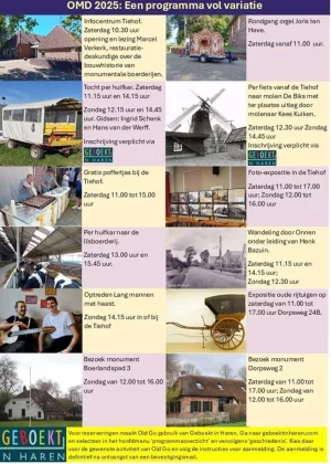De start van Open Monumentendag is op zaterdag 13 september om 10.30 uur (inloop vanaf 10.15 uur) met een lezing door Marcel Verkerk, restauratiedeskundige/bouwhistoricus van de gemeente Groningen over de bouwhistorie van monumentale boerderijen. Zie programma op www.oldgo.nl (nieuws)